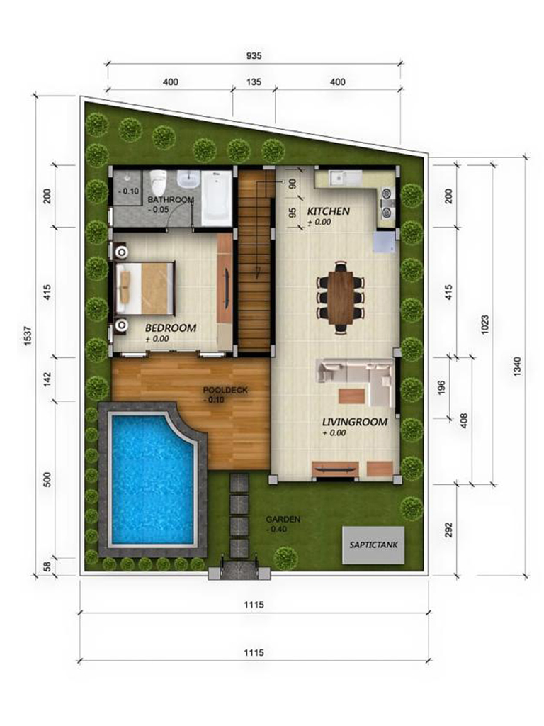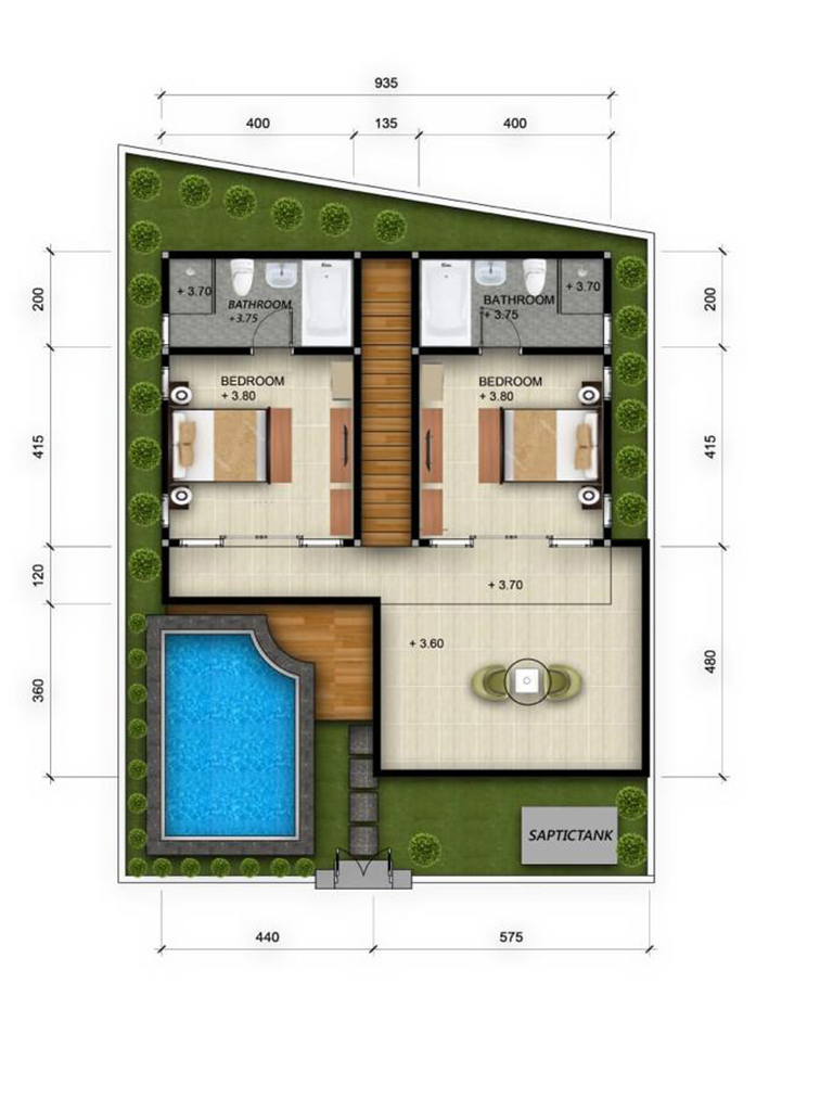 A perfect setting for parents and their children. This two-story building comprises one master bedroom and two bedrooms upstairs, each room with a private bathtub. We were combined classic and natural styles in each room. Try to lie down on the sun deck next to your private swimming pool to enjoy the imaginable tropical home you could have.